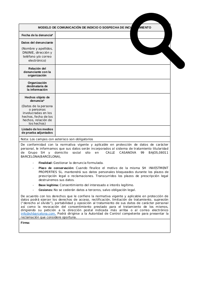 GRUPO SH guarantees confidentiality or anonymity, as appropriate, for individuals using the Ethical Channel, as well as the management of all personal data of those involved in the procedure in accordance with current and applicable data protection regulations.
